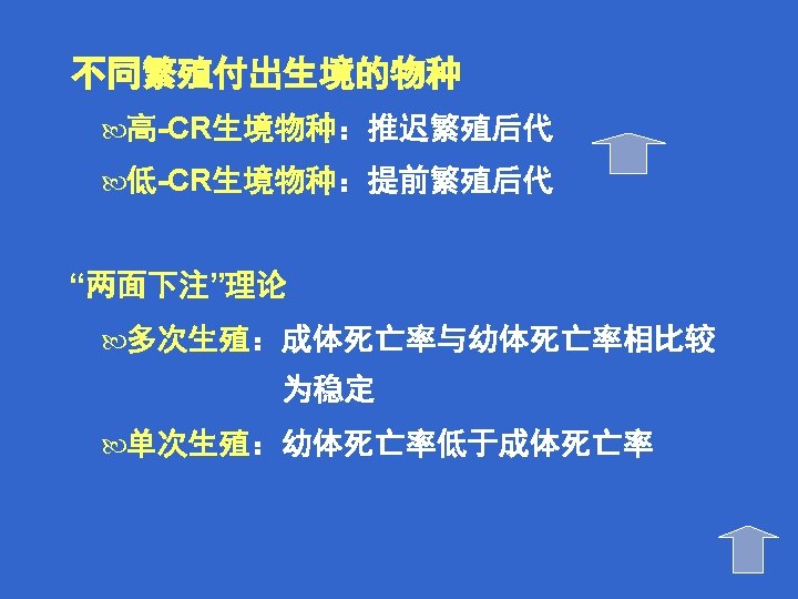 Energy allocated to one aspect of life history Energy allocation and trade-offs cannot be spent in another, so ‘trade-offs’ between different traits are inevitable. Energy allocation: semelparity or iteroparity many small offspring or less large offspring 分配给生活史一方面的能量不能再用在另一方面, 能量分配和 “权衡” 所以在不同生活史特性间进行“权衡”是不可避免的。 能量分配:单次生殖或多次生殖 许多小型后代或较少较大型后代