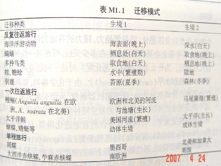 There are three categories of migration, depending on whether an individual makes (i) repeated return trips (ii) a single return trip, (iii) a one- way trip. 迁移有三种,依据生物个体做的是 (i)反复的往返旅行, (ii)单次往返旅行, (iii)单程旅行。