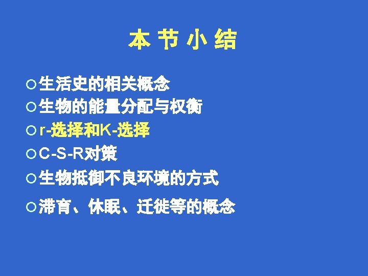 Life History What is life history? How does energy allocation and trade-off? What is life history strategy? (Important and difficult parts) r-selection and K-selection C-strategy, S- strategy and R- strategy How does organism adapt to unfavorable conditions?