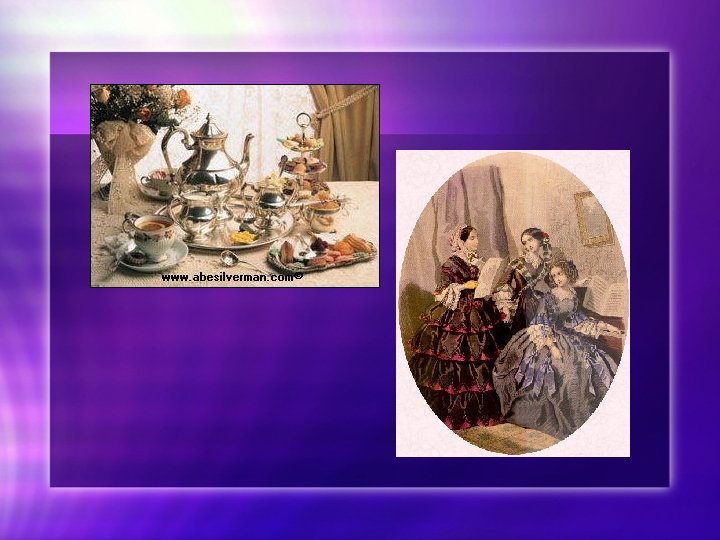 Daily routine l 4 o’clock tea l Evening meal-8 o’clock, formal l Middle class had “high tea” which included entrée of fish, eggs, cheese, and salad l Retired to parlor after dinner