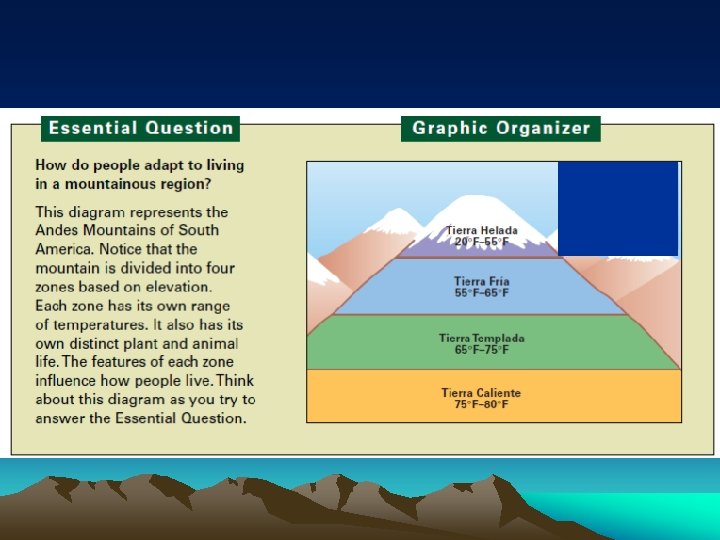 Definitions Altitudinal zonation – the division of land into zones based on elevation Snow line – lowest elevation on mountains where snow remains year-round Terracing – creation of flat areas on mountain slopes for the purpose of farming Vertical trade – trading of crops between highland lowland areas