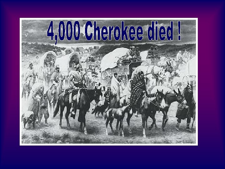 Trail of Tears • 1791 - US Treaty recognizes Cherokee territory in Georgia. – Cherokee people had created a thriving, independent nation. – Andrew Jackson (President) believed that the “best Indian was a dead Indian”. – Jackson authorizes their forced removal in 1830. – State of Georgia wanted the land that the Cherokee nation was on and vowed to get it any way possible! • By 1838 - US/State troops had rounded up the people of the Cherokee nation and readied them for a march to “Indian territory” of Oklahoma. – 16, 000 Cherokee were forcibly removed and marched 800 miles in the dead of winter