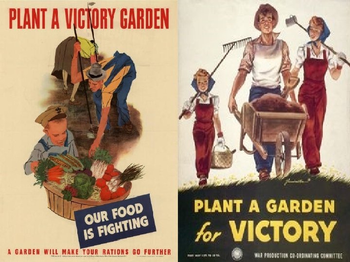 “Victory Gardens” • U. S. Citizens Were Asked to Grow Gardens at Home • Less Food Would Be Bought At Stores • Extra Food Could Then Be Shipped to the Soldiers in Europe!