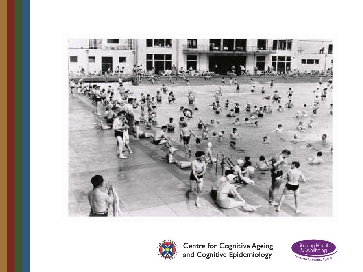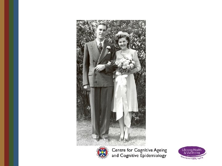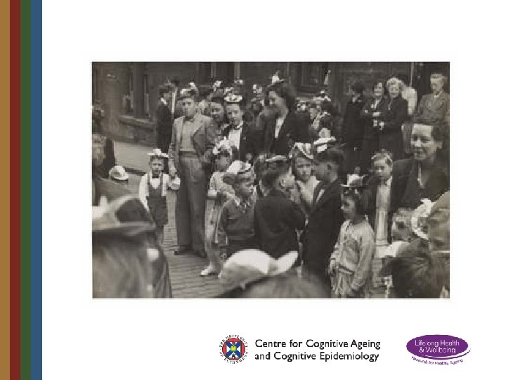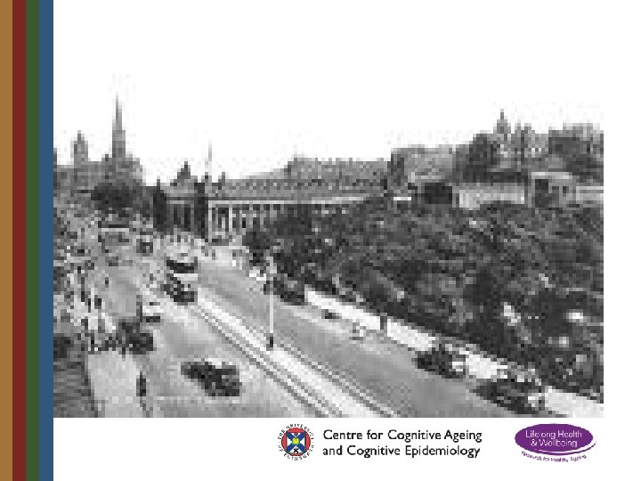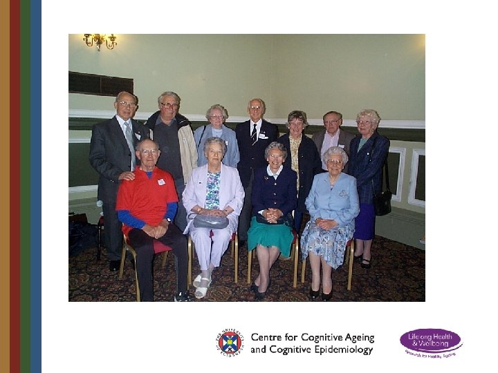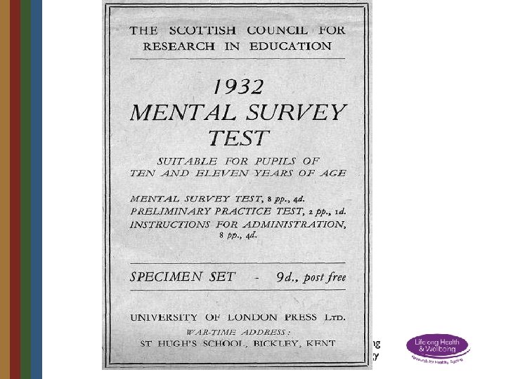 Lothian Birth Cohort 1921 • Born in 1921 • At school in Scotland in 1932 aged 11 • Scottish Mental Survey administered to all 87, 498 pupils on same day in 1932 • 550 traced in 2001 aged 79 and re-tested • Intelligence remarkably stable across lifetime with age 11 test accounting for 50% of variance • Other contributors to later intelligence included education, occupation, health, brain ageing • 90 year old testing – 2011/12