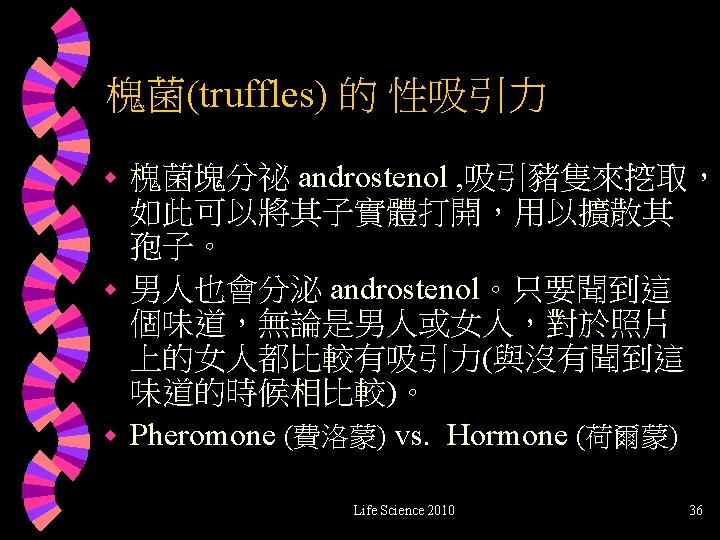 這些槐菌(truffles) 含有androstenol 的性吸引素(豬) Life Science 2010 35
