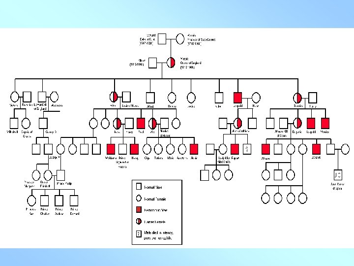 Extra credit question. A)Alexis did not die from hemophilia. At the age of fourteen he was executed with the rest of the family. His four oldest sisters were also young and didn’t have children, so we don’t know whether any of them was a carrier. But we can make an estimate. a) What are the probabilities that all four of the girls were carriers of the allele hemophilia? b) Supposing Alexis had lived and married a normal woman, what are the chances that his daughter would be a hemophiliac? c) What are the chances his daughters would be carriers? d) What are the chances that his sons would be hemophiliacs? (4 points) B)Mr. Jones has type A blood. His wife has type AB blood. Their first child has type B blood. What are the possible phenotypes for future offspring and the probabilities for each one? (2 points) For both parts of Extra credit question – 6 points