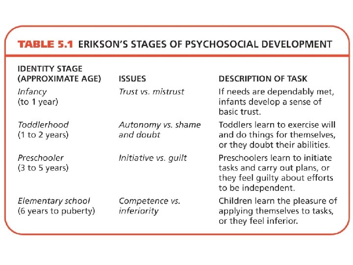 Erikson p constructed an 8 -stage theory of psychosocial development p each stage of life presents a unique set of social demands and conflicts p the way each demand/conflict is handled leads to a more or less desirable outcome