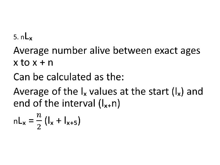 First four columns of the life table: • Life table variables : 1. Age interval (e. g. 1 year, 1 -4 years, etc. ) 2. ( nqₓ ) the percent of dying between ages x and age x+n 3. ( lₓ) Number of alive at an exact age x 4. n dₓ Number of deaths between ages x and x+n