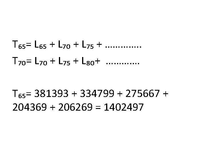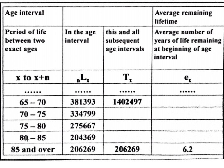 Ages Column 2 Column 3 Column 4 X to X + n Tₓ Iₓ eₓ 60 -64 65 -69 70 -74 90547 86208 79646 I₆₅= 86208 1989624 1547738 1133102 21. 97 17. 95 14. 23 T₆₅= 1547738 e₆₅= 1547738 / 86208 = 17. 95