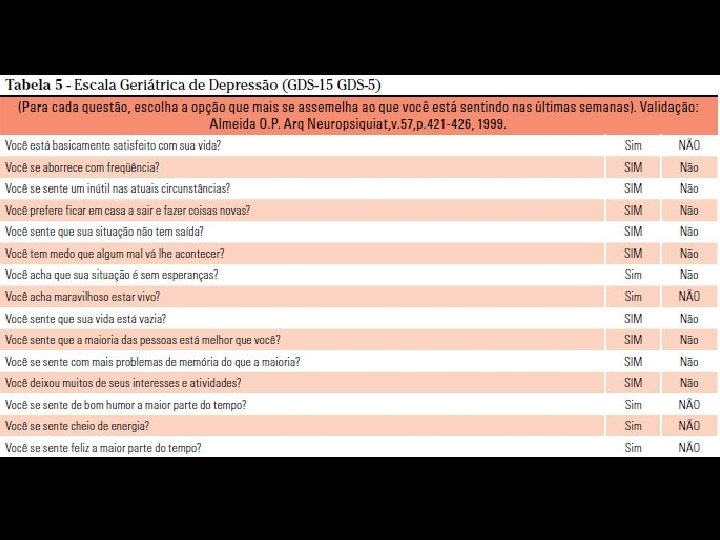 Avaliação: � 0 = Quando a resposta for diferente do exemplo entre parênteses. � 1= Quando a resposta for igual ao exemplo entre parênteses. �Total > 5 = suspeita de depressão