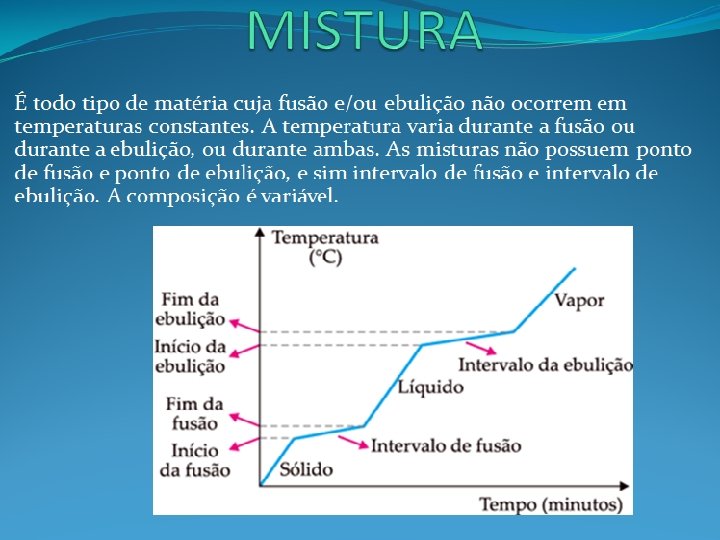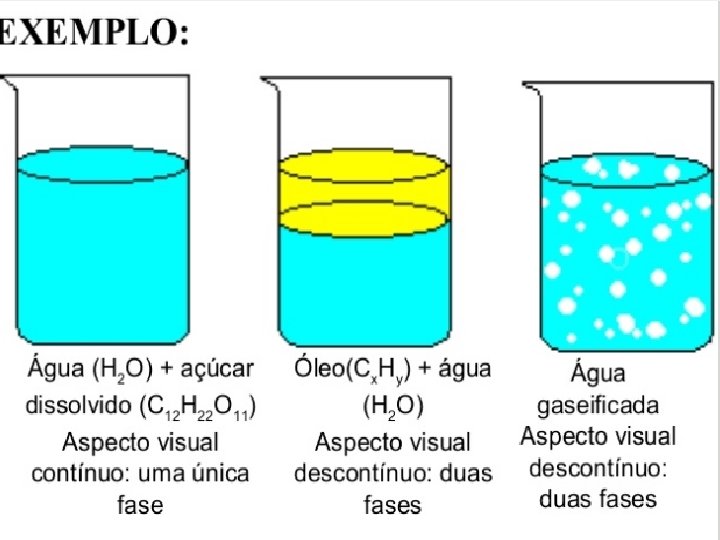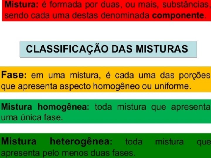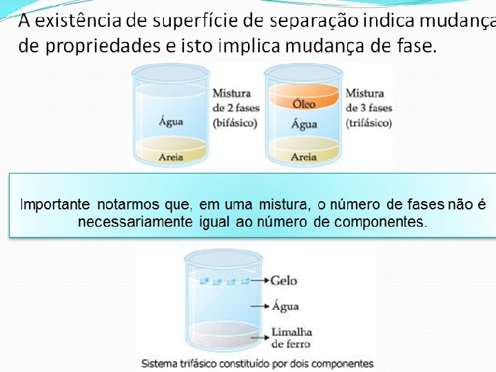 Fase: corresponde a cada porção uniforme de uma matéria. Componente: corresponde a cada substância que participa da mistura. Mistura de dois ou mais sólidos será sempre heterogênea e cada sólido corresponde a uma fase. Sal e serragem: 2 componentes e 2 fases. Granito: 3 componentes (mica, feldspato e quartzo) e 3 fases. MISTURA DE GASES É SEMPRE HOMOGÊNEA