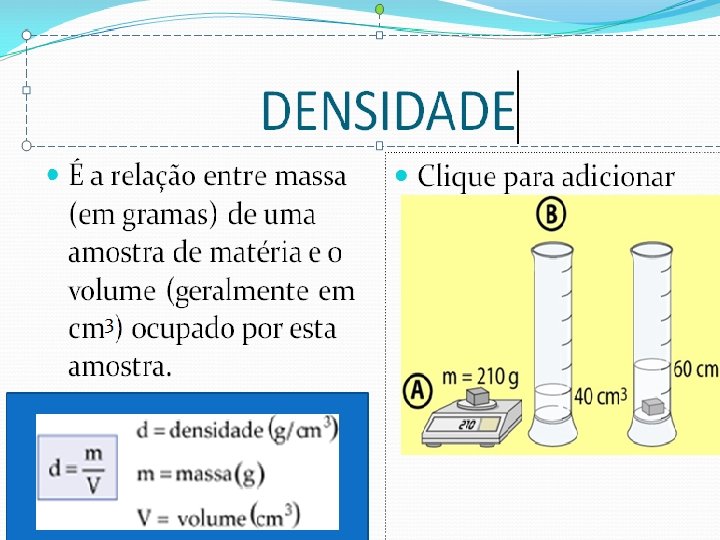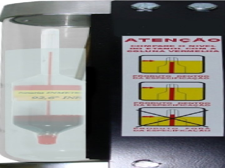 A densidade de um líquido pode ser medida na prática por meio de um aparelho chamado densímetro. Ele é formado por um tubo de vidro com uma haste graduada em densidades e, na parte inferior, possui uma parte mais larga e mais “pesada”. Ao ser colocado no líquido, o densímetro fica numa posição em que o nível do líquido fica exatamente em cima da graduação na haste. • O densímetro é muito usado para verificar adulterações em determinados produtos. Por exemplo, você já deve ter visto em postos de gasolina um densímetro que fica à mostra mergulhado no etanol.