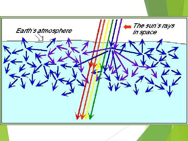 Why is the sky blue? • Raleigh Scattering • https: //www. youtube. com/watch? v=VGMnztlt Vh 0 • Atmosphere is made up almost entirely of nitrogen molecules and oxygen molecules (both about the same size) • Sir Raleigh determine that the size of the particle determines the wavelength of radiation that it will scatter the most • Smaller particles scatter shorter wavelengths; longer wavelengths don’t even notice them • For Earth, blue wavelengths are scattered the most…. Some of the other radiation as well, but HUGELY in favor of blue.