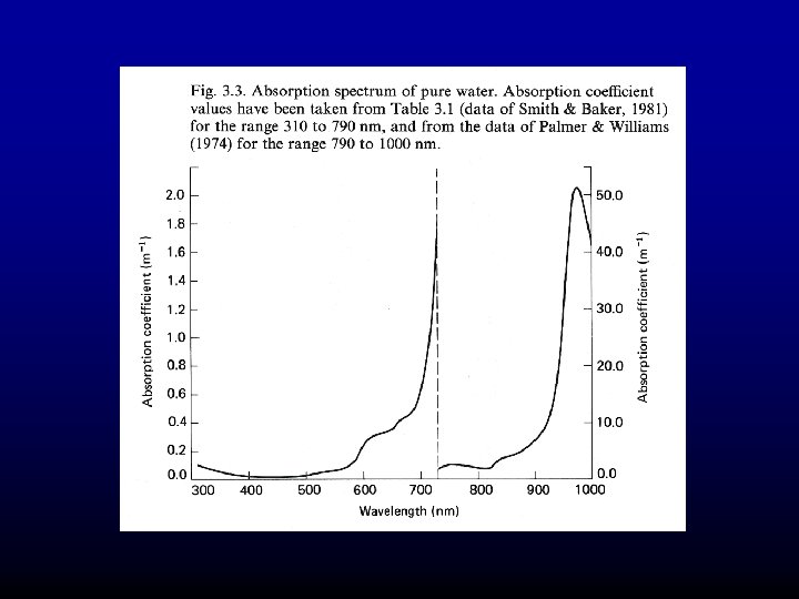 Changing the relative proportions of materials in the water column also impacts color of the water Dissolved organics Phytoplankton 0. 7 Absorption (1/m) 0. 6 0. 5 0. 4 0. 3 0. 2 0. 1 0 400 -0. 1 450 500 550 600 wavelength (nm) 650 700
