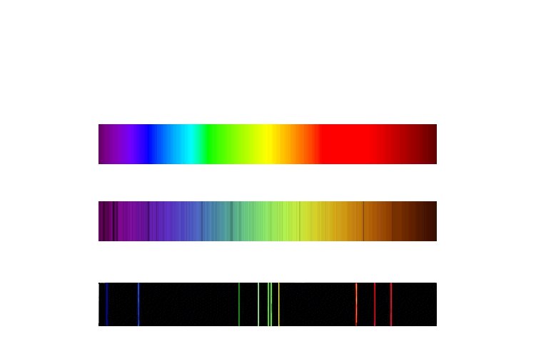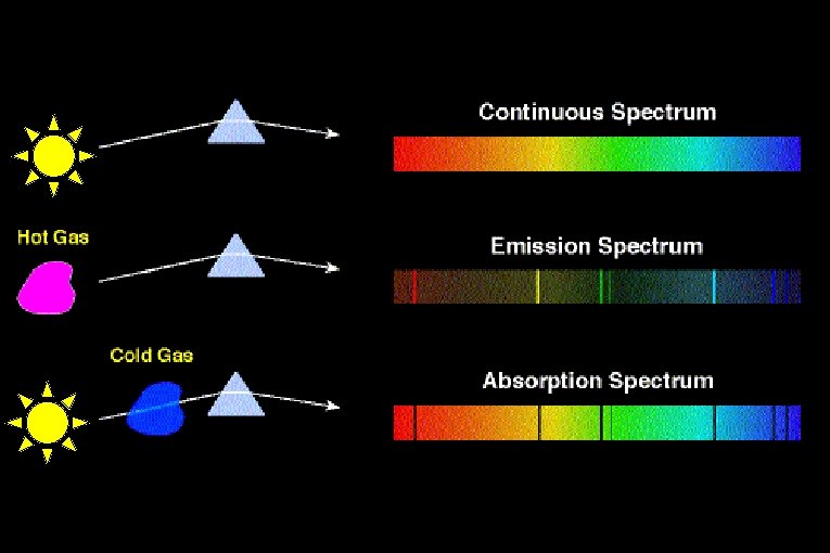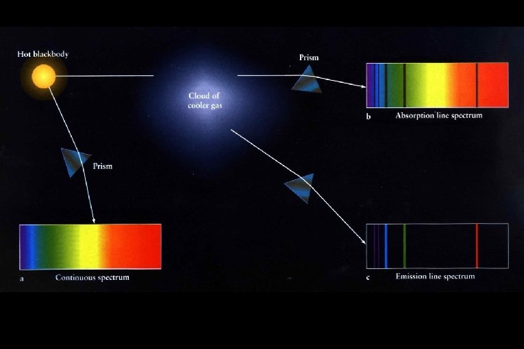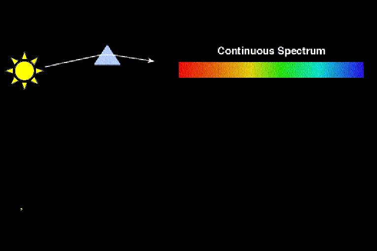 Absorption Spectra • If light shines through a gas, each element will absorb those photons whose energy match their electron energy levels. The resulting absorption line spectrum has all colors minus those that were absorbed.