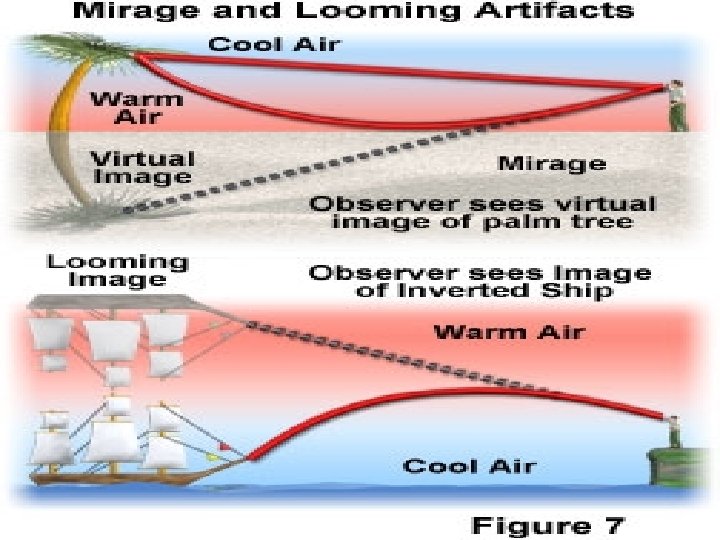 Atmospheric Refraction • Mirages, floating images that appear in the distance, are due to the refraction of light in the Earth’s atmosphere. • On hot days, there is a layer of hot air in contact with the ground and cooler air above it. • Because light travels faster in the hot air than the cooler air above it, there is a gradual bending of the light rays. This can produce an inverted image to an observer just as if it were reflected from a surface of water. • www. astronomycafe. net/weird/lights/mirgal. htm