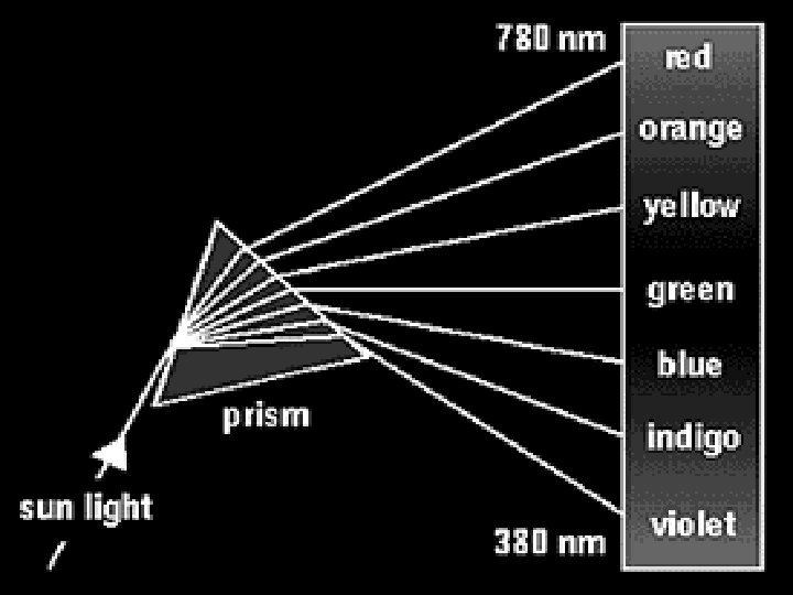 Color Spectrum (from longest to shortest wavelengths) ROYGBIV 1. Red 5. Blue 2. Orange 6. Indigo 3. Yellow 7. Violet 4. Green