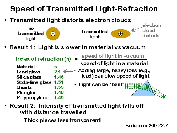 Index of Refraction and the Speed of Light • The index of refraction is also a measure of how fast light travels when it passes into a medium from a vacuum. • Index of Refraction nsubstance = c / vsubstance