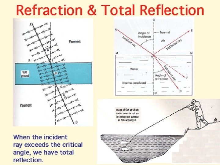 Effects of Refraction and Total Internal Reflection • • An object may be located at a greater depth than it appears. A submerged object near the surface may appear to be inverted. An object near the surface of a pool may not be visible to an observer standing near the edge. The effects of total internal reflection are applied in the field of fiber optics.