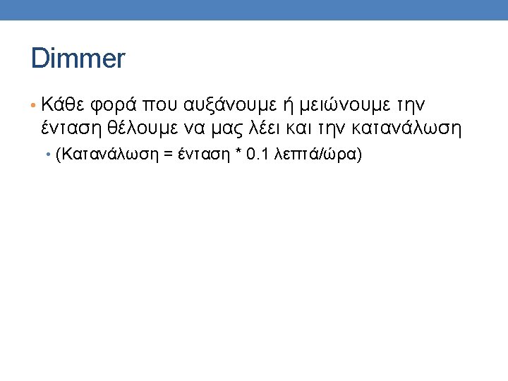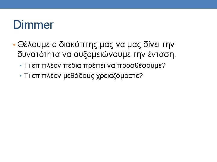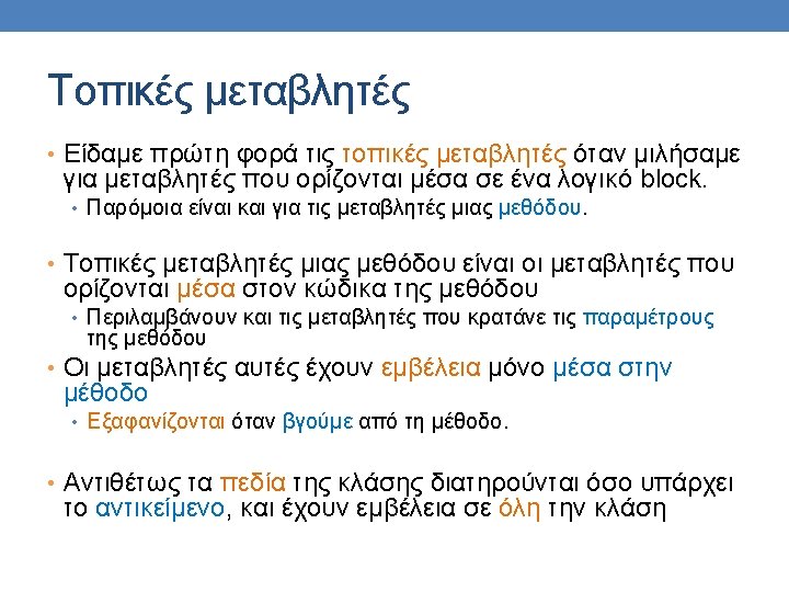 class Dimmer. Light 2 { private boolean light. Is. On = false; private intensity = 100; public void flip. Switch(){ light. Is. On = !light. Is. On; } Οι μεταβλητές consumption είναι τοπικές μεταβλητές public void dim(){ if (intensity > 0){ intensity --; } double consumption = intensity *0. 1; System. out. print("Consumption = "+consumption); } Υπάρχουν μόνο μέσα στις μεθόδους η public void birghten(){ dim και brighten και όταν τελειώσει if (intensity < 100){ intensity ++; κλήση τους εξαφανίζονται. } double consumption = intensity *0. 1; System. out. print("Consumption = "+consumption); } public void print. State(){ if (light. Is. On){ System. out. println("The light is ON with intensity " + intensity); }else{ System. out. println("The light is OFF"); } } }