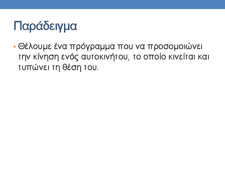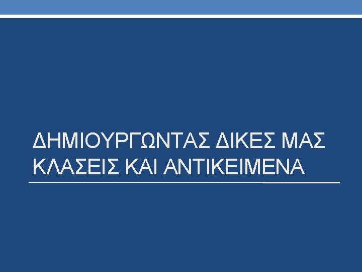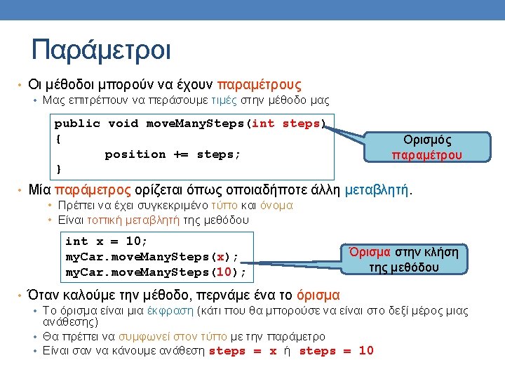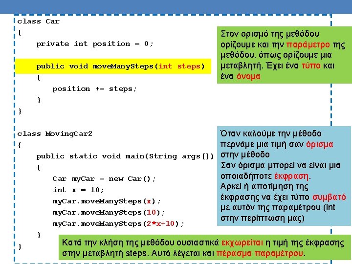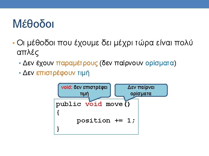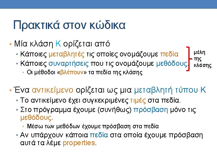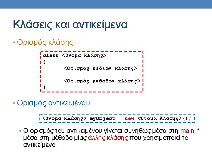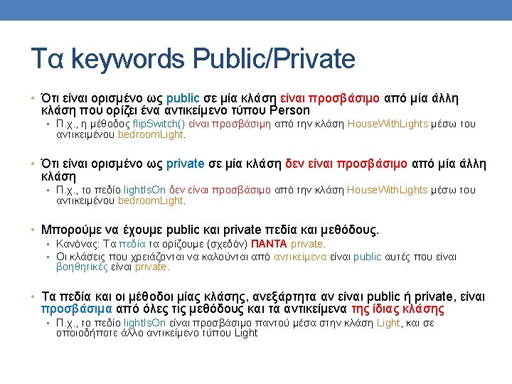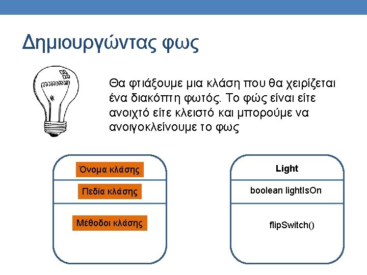 Light class Light { private boolean light. Is. On = false; public void flip. Switch() { light. Is. On = !light. Is. On; } Ορισμός κλάσης Ορισμός (και αρχικοποίηση) πεδίου Ορισμός μεθόδου Χρήση πεδίου } class House. With. Lights { public static void main(String[] args) { Ορισμός αντικειμένου Light bedroom. Light = new Light(); bedroom. Light. flip. Switch(); Κλήση μεθόδου } }