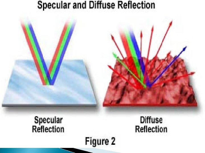 REFLECTION – bouncing of light when it strikes a surface. Kinds: 1. Normal – light strikes a very smooth surface - incident rays bounce off evenly, reflected rays are not scattered - virtual image (clear & sharp image) 2. Diffuse – light strikes rough surfaces - reflected rays are scattered - no image is formed * Rays/beams of light – light radiating from the source 2 kinds: a. Incident rays – strike the surface b. Reflected rays – bounce off