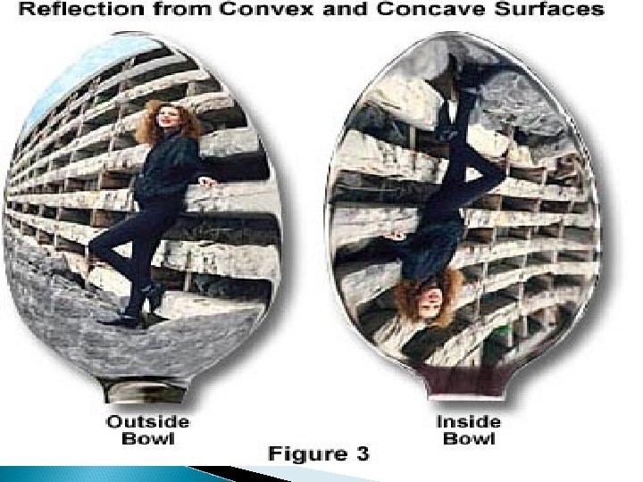 KINDS OF MIRROR (very good reflector of light) 1. Plane – clear and sharp reflection and gives virtual image 2. Concave – curved inward and gives larger view ex: searchlights, headlights, flashlights, cosmetic mirrors, driver’s rear mirror 3. Convex – curved outward and gives smaller view ex: car’s side mirrors, shopping centers