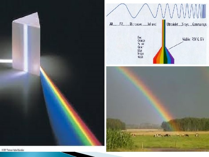 COLORS * White light (sunlight) is a mixture of colors and is refracted and separated by a prism. *Visible Spectrum -band of colors(ROYGBIV ) Red – longest wavelength and is bent the least Violet – shortest wavelength and is bent the most *The color you see in the object is the color that is not absorbed by the object, thus reflected. Ex: banana- all colors are absorbed except yellow (reflected) * White – all colors are reflected * Black – all colors are absorbed