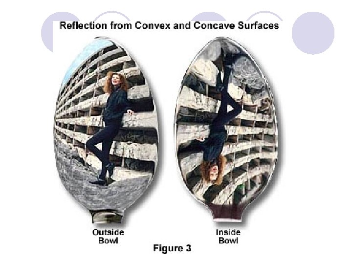 Concave mirrors l curve inward - like a “cave” ¡Close up – image is enlarged, right-side up. ¡Further away – image is enlarged, but upsidedown. ¡The further away you move, the smaller the image gets.