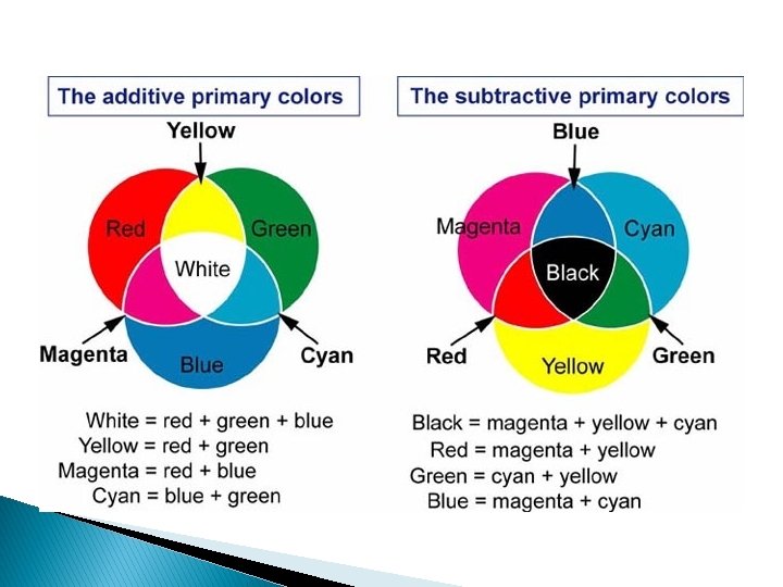 LIGHT AND COLOR � � � Colored fabrics and paints get color from a subtractive process. Chemicals, known as pigments, in the dyes and paints, absorb some colors and allow the color you actually see to be reflected. Magenta, yellow, and cyan are three subtractive primary colors.