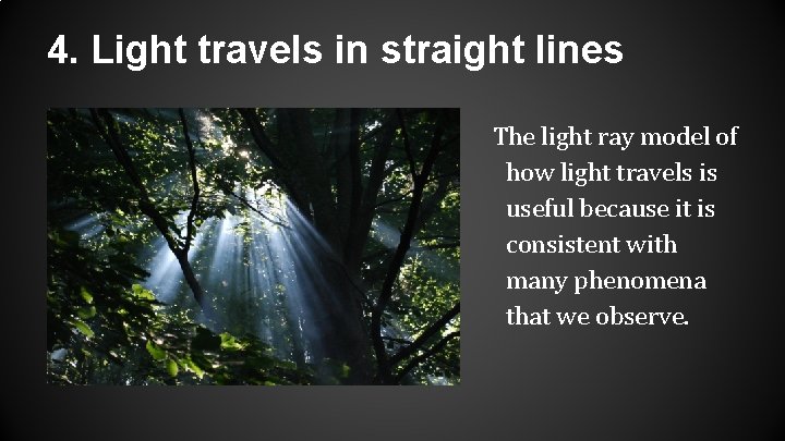 4. Light travels in straight lines The light ray model of how light travels is useful because it is consistent with many phenomena that we observe.