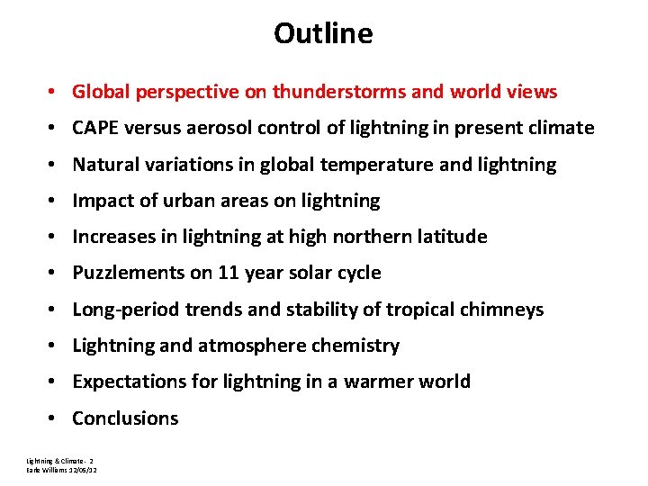 Outline • Global perspective on thunderstorms and world views • CAPE versus aerosol control of lightning in present climate • Natural variations in global temperature and lightning • Impact of urban areas on lightning • Increases in lightning at high northern latitude • Puzzlements on 11 year solar cycle • Long-period trends and stability of tropical chimneys • Lightning and atmosphere chemistry • Expectations for lightning in a warmer world • Conclusions Lightning & Climate - 2 Earle Williams 12/05/12