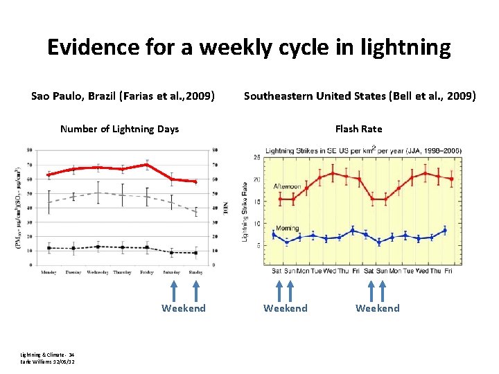 Evidence for a weekly cycle in lightning Sao Paulo, Brazil (Farias et al. , 2009) Southeastern United States (Bell et al. , 2009) Number of Lightning Days Flash Rate Weekend Lightning & Climate - 34 Earle Williams 12/05/12 Weekend