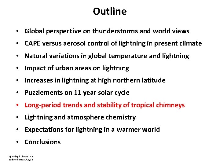 Outline • Global perspective on thunderstorms and world views • CAPE versus aerosol control of lightning in present climate • Natural variations in global temperature and lightning • Impact of urban areas on lightning • Increases in lightning at high northern latitude • Puzzlements on 11 year solar cycle • Long-period trends and stability of tropical chimneys • Lightning and atmosphere chemistry • Expectations for lightning in a warmer world • Conclusions Lightning & Climate - 17 Earle Williams 12/05/12