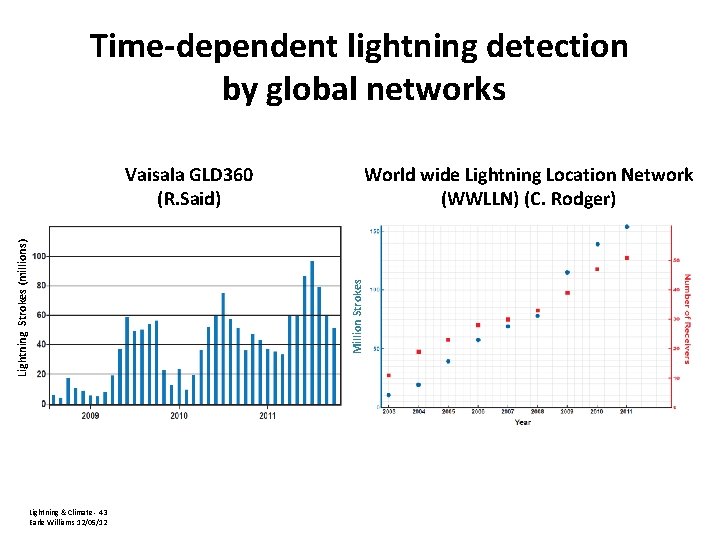 Time-dependent lightning detection by global networks World wide Lightning Location Network (WWLLN) (C. Rodger) Million Strokes Lightning Strokes (millions) Vaisala GLD 360 (R. Said) Lightning & Climate - 43 Earle Williams 12/05/12