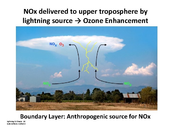 NOx delivered to upper troposphere by lightning source → Ozone Enhancement Boundary Layer: Anthropogenic source for NOx Lightning & Climate - 55 Earle Williams 12/05/12