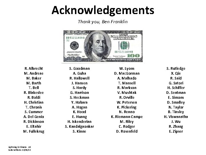 Acknowledgements Thank you, Ben Franklin R. Albrecht M. Andreae M. Baker M. Barth T. Bell R. Blakeslee R. Boldi H. Christian T. Chronis S. Cummer A. Del Genio R. Dickinson E. Eltahir M. Fullekrug Lightning & Climate - 63 Earle Williams 12/05/12 S. Goodman A. Guha R. Hallowell J. Hansen S. Hardy G. Harrison S. Heckman Y. Hobara A. Hogan K. Hood E. Huang H. Iskenderian S. Kandalgaonkar S. Kinne W. Lyons D. Mac. Gorman A. Malhado T. Mansell R. Markson V. Mushtak R. Orville W. Petersen K. Pickering N. Renno K. Riemann-Campe M. Riley C. Rodger D. Rosenfeld S. Rutledge X. Qie R. Said G. Satori H. Schiffer D. Sentman E. Simons D. Smalley N. Taylor B. Tinsley H. Viswanatha J. Wu R. Zhang E. Zipser