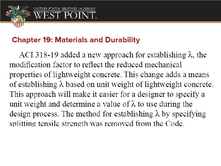 What changed The new lambda (l) is not universal for LWC! • 15. 4. 2. 3 – Joint shear strength, l = 0. 75 • 18. 8. 2. 3 – Longitudinal beam reinforcement through a beam-column joint, l = 0. 75 • 18. 8. 4. 3 – Nominal joint shear strength, l = 0. 75 • 22. 9. 4. 2 – Coefficients of friction, l ≤ 0. 85 • Table 25. 4. 2. 5 – Development length (T), l = 0. 75 • Table 25. 4. 3. 2 – Hooked bars in tension, l = 0. 75 • Table 25. 4. 9. 3 – Development length (C), l = 0. 75