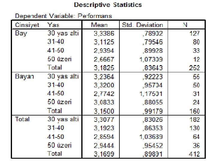 Tablonun Cinsiyet * Yaş satırındaki değerlerden cinsiyet ve yaşın performans üzerindeki ortak etkisinin (p = 0, 224, p > 0, 05) istatistiksel olarak anlamlı olmadığı görülmektedir. Bu bulgular ışığında erkek ve kadın öğretmenlerin performansları yaşlarına bağlı olarak farklılık göstermez. Diğer bir ifade ile farklı yaş gruplarındaki erkek ve bayan öğretmenlerin performansları arasındaki fark istatistiksel olarak anlamlı değildir. Ayrıca tablonun Cinsiyet satırındaki anlamlılık değeri (p= 0, 417, p > 0, 05) performans ile cinsiyet arasındaki ilişkin istatistiksel olarak anlamlı olmadığını göstermektedir. Tablonun yaş satırındaki anlamlılık değeri ise ( p = 0, 003, p < 0, 01) performans ile yaş arasındaki ilişkinin p < 0, 01 düzeyinde istatistiksel olarak anlamlı olduğunu ortaya koymaktadır. Diğer bir ifade ile performans cinsiyete bağlı olarak anlamlı bir farklılık göstermezken yaşa bağlı olarak farklılık göstermektedir.