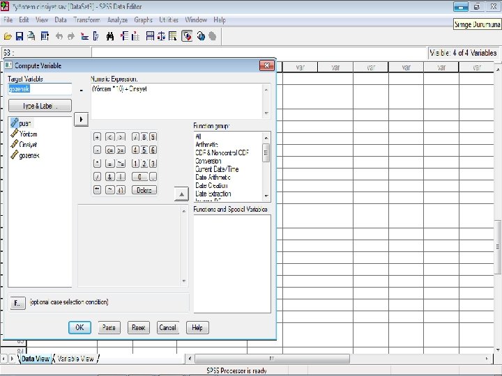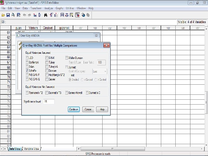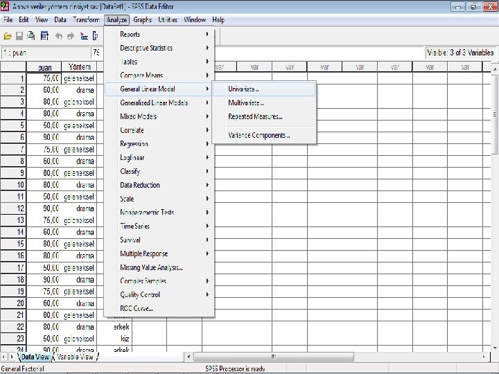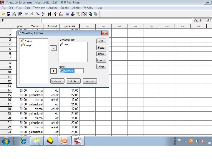 Amaç Bağımsız örneklem iki yönlü varyans analizi, belli bir bağımlı değişken üzerinde (Örneğimizde, Öğretmenlerin performansı), birden fazla bağımsız değişkenin (Örneğimizde, Öğretmenlerin cinsiyeti ve kıdemi) ortak etkisini ölçmek için kullanılır.