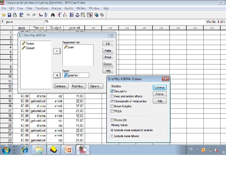 Varsayımlar Varsayım 1: Bağımlı değişken her bir örneklem için normal dağılım göstermelidir. Varsayım 2: Tüm hücreler için bağımlı değişkenin varyansı eşit olmalıdır. Bu varsayım gerçekleşmediğinde ve örneklem büyüklükleri her bir hücre için farklılık gösterdiğinde 2 yönlü anova sonuçları güvenirliğini kaybetmektedir. Varsayım 3: Her bir case(birim) evrenden random olarak seçilmelidir ve bağımlı değişkene ilişkin puanlar her bir case için birbirinden bağımsız olmalıdır. (Green ve Salkind, 2008, s. 194. Using SPSS For Windows And Macintosh. New Jersey: Pearson Prentice Hall)