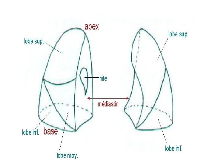 Les lobes pulmonaires de profil Lobe sup droit Lobe sup gauche Lobe inf gauche Lobe moyen Lobe inf droit Poumon droit vue externe Poumon gauche vue externe