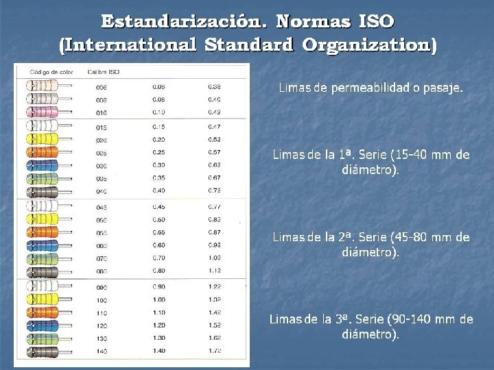 1955 John I. Ingle de la FOW, creó la posibilidad de fabricar instrumentos endodónticos que tuvieran una estandarización con el aumento secuencial de sus diámetros. 1958 Ingle y Levine, sugirieron que los instrumentos y conos endodónticos se fabricaran según normas preestablecidas. 1962 que la Asociación Americana de Endodoncia (AAE) aceptó la sugerencia.