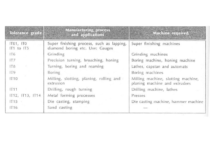 Grades of Tolerance Grade of Tolerance: It is an indication of the level of accuracy. There are 18 grades of tolerances – IT 01, IT 0, IT 1 to IT 16 IT 01 to IT 4 - For production of gauges, plug gauges, measuring instruments IT 5 to IT 7 - For fits in precision engineering applications IT 8 to IT 11 – For General Engineering IT 12 to IT 14 -For Sheet metal working or press working 14 IT 12 to IT 14 –For Sheet metal working or press working IT 15 to IT 16 – For processes like casting, general cutting work
