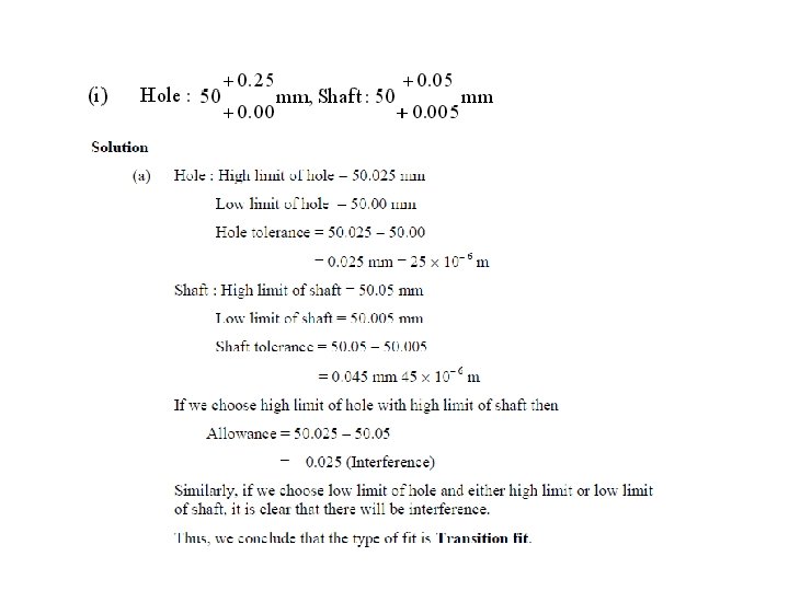 Transition fit • In a fit of this type, the diameter of the largest allowable hole is greater than that of the smallest shaft, but the smallest hole is smaller than the largest shaft, so that, small positive or negative allowance between the shaft and hole members are employable. • In this type of fit, the size limits of mating (shaft and hole) parts are so selected that, either clearance or interference may occur depending upon the actual size of the parts.