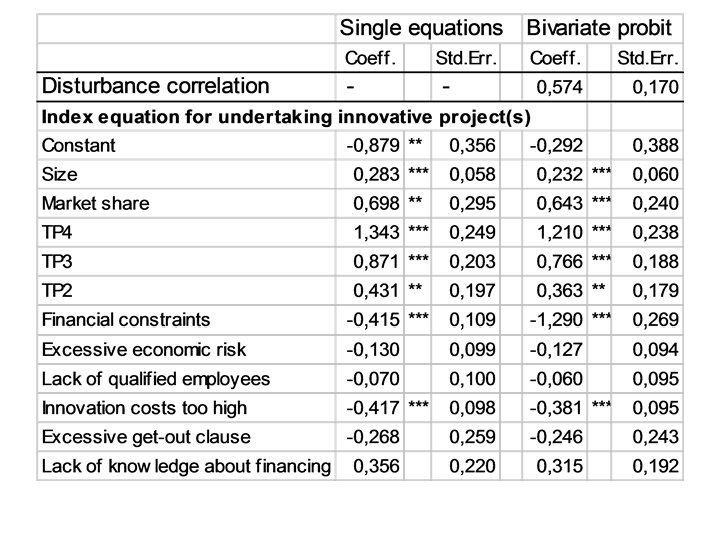 Estimation avec l’indicateur direct Problème économétrique : endogénéité potentielle de notre variable qualitative de contraintes financières dans l ’équation d ’innovation, car - Hétérogénéité inobservée. Des facteurs inobservés sont susceptibles d ’affecter simultanément la probabilité d ’innover et celle de faire face à des contraintes financières spécifiques au projet innovant: durée du projet, besoin de confidentialité pour des raisons stratégiques. . . -Simultanéité entre la décision d ’innover et les problèmes de financement du projet innovant. D ’où estimation simultanée avec un probit bivarié récursif (Greene, 1998) de: - la probabilité d’innover - la probabilité de rencontrer des contraintes financières