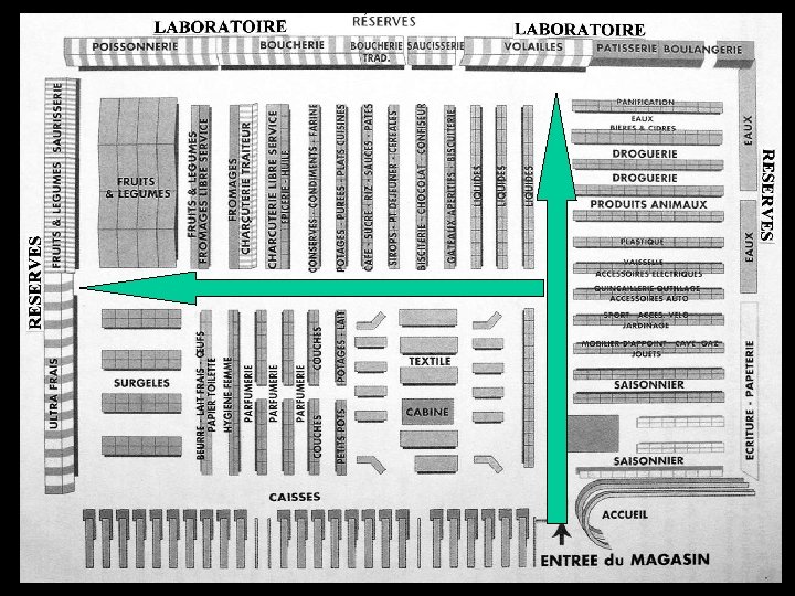 Résumons !. . . La tendance naturelle du client est de tourner à droite et de rester dans la première partie du magasin… Les rayons situés à droite en entrant sont les rayons télé, hi-fi, vidéo et informatique… Quel est le but recherché par le magasin ? . . .