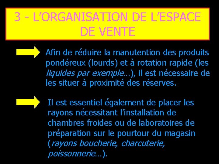 3 - L’ORGANISATION DE L’ESPACE DE VENTE Afin de réduire la manutention des produits pondéreux (lourds) et à rotation rapide (les liquides par exemple…), il est nécessaire de les situer à proximité des réserves. Il est essentiel également de placer les rayons nécessitant l’installation de chambres froides ou de laboratoires de préparation sur le pourtour du magasin (rayons boucherie, charcuterie, poissonnerie…).