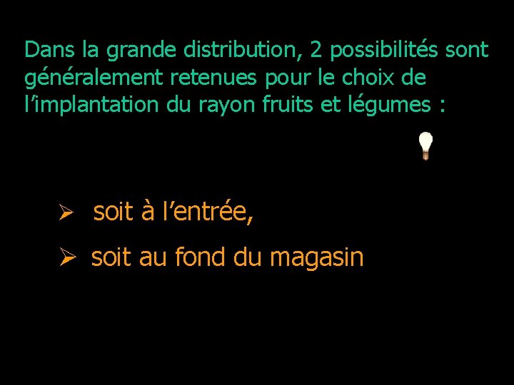 Dans la grande distribution, 2 possibilités sont généralement retenues pour le choix de l’implantation du rayon fruits et légumes : Ø soit à l’entrée, • 2 possibilités d' Ø soit au fond du magasin