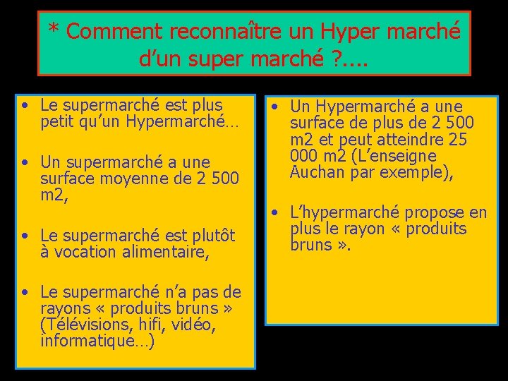 * Comment reconnaître un Hyper marché d’un super marché ? . . • Le supermarché est plus petit qu’un Hypermarché… • Un supermarché a une surface moyenne de 2 500 m 2, • Le supermarché est plutôt à vocation alimentaire, • Le supermarché n’a pas de rayons « produits bruns » (Télévisions, hifi, vidéo, informatique…) • Un Hypermarché a une surface de plus de 2 500 m 2 et peut atteindre 25 000 m 2 (L’enseigne Auchan par exemple), • L’hypermarché propose en plus le rayon « produits bruns » .